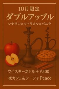 ご覧いただきありがとうございます! JR福山駅から徒歩10分!! 夜カフェ&シーシャPEACE【霞町店】です! 本日は10月限定PEACEオリジナルミックスのご紹介になります!! 秋にぴったりのアップルとシナモン、キャラ […]